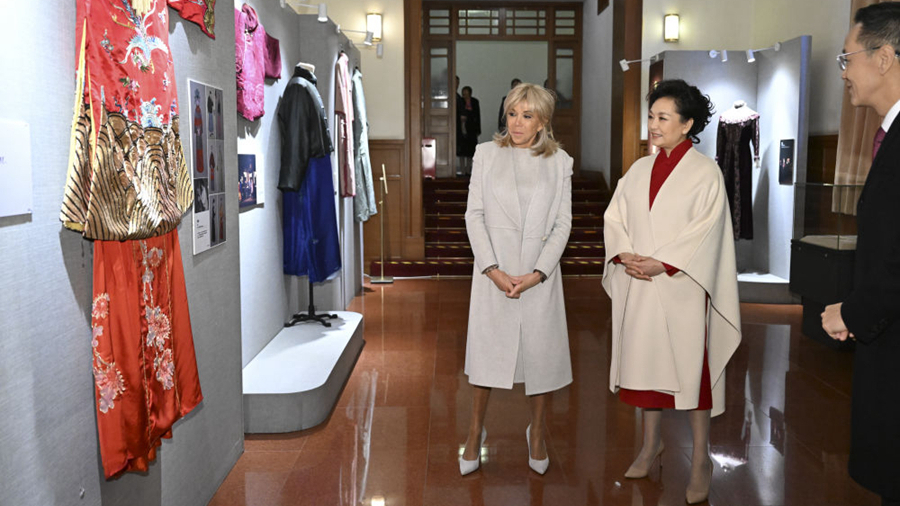 លោកស្រីPeng liyuan និងលោកស្រីBrigitte Marie-Claude Trogneux ភរិយារបស់ប្រធានាធិបតីបារាំងអញ្ជើញទស្សនារោងមហោស្រពសិល្បៈប្រជាជនប៉េកាំង